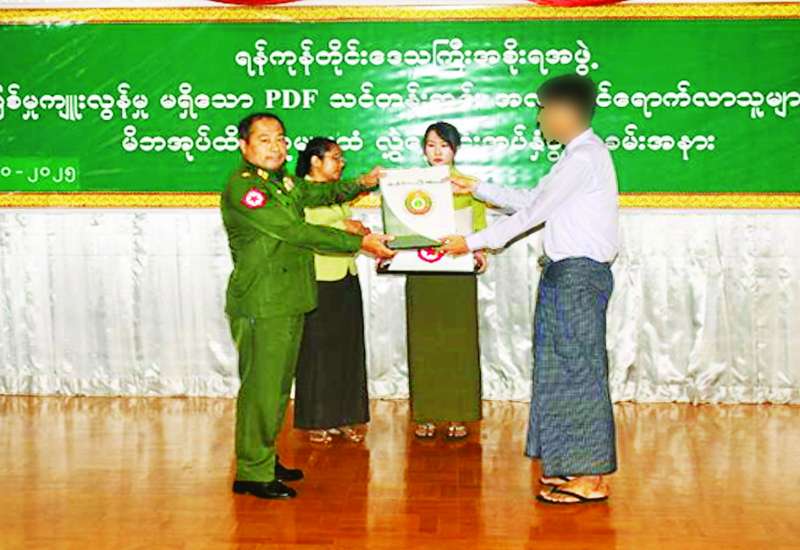 နိုင်ငံတော်အစိုးရသည် PDF အပါအဝင် အဖွဲ့အစည်းအမျိုးမျိုး အမည်ခံ၍ လက်နက်ကိုင်ဆန့်ကျင် လျက်ရှိသည့်် အဖွဲ့အစည်းများ အတွင်း ရောက်ရှိနေသူများအား ဥပဒေဘောင်အတွင်းသို့ ပြန်လည် ဝင်ရောက်ရန် ဖိတ်ခေါ်၍ ဥပဒေဘောင်အတွင်းသို့ ပြန်လည်ဝင်ရောက်လာကြသူများကိုလည်း လိုအပ်သည့်ကူညီပံ့ပိုးမှုများ ဆောင်ရွက်ပေးလျက်ရှိရာ နိုင်ငံတော်နှင့်တပ်မတော်၏ ငြိမ်းချမ်းရေးလုပ်ငန်းစဉ်များကို နားလည် သဘောပေါက်လာသည့် PDF အမည်ခံအဖွဲ့မှ အဖွဲ့ဝင် အမျိုးသား ၁၂ ဦးနှင့် အမျိုးသမီး သုံးဦးတို့သည် ယနေ့တွင် ဥပဒေဘောင်အတွင်းသို့ ထပ်မံဝင်ရောက်လာကြသည်။