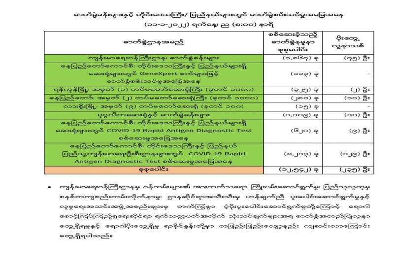 ၁။ ကျန်းမာရေးဝန်ကြီးဌာနသည် “ကိုဗစ်-၁၉ ရောဂါ မျိုးရိုးဗီဇပြောင်း ရောဂါပိုးစောင့်ကြပ်ကြည့်ရှုခြင်း လုပ်ငန်း” များကို စဉ်ဆက်မပြတ်ဆောင်ရွက်လျက်ရှိရာ မြန်မာနိုင်ငံသို့ ပြည်ပနိုင်ငံများမှ ကယ်ဆယ်ရေး လေယာဉ် (Relief Flight) များဖြင့် ပြန်လည်ဝင်ရောက်လာသူများတွင် SARS CoV-2 Variant Omicron (အိုမီခရွန်) ရောဂါပိုးတွေ့ရှိမှုများနှင့် ပတ်သက်၍ ကျန်းမာရေးဝန်ကြီးဌာနမှ အချိန်နှင့်တစ်ပြေးညီ သတင်းထုတ်ပြန်ပေးလျက်ရှိပါသည်။