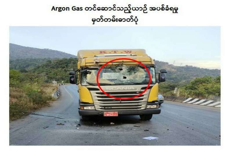 ကရင်ပြည်နယ်၊ မြဝတီမြို့မှ မန္တလေးမြို့သို့ ပို့ဆောင်ရန် Argon Gas အရည်များ တင်ဆောင်လာသည့် မော်တော်ယာဉ်အား ယနေ့ညနေပိုင်းတွင် PDF အမည်ခံအကြမ်းဖက်သမားများက လက်နက်ငယ်များဖြင့် အကြောင်းမဲ့ ပစ်ခတ်ခဲ့ကြောင်း သိရှိရသည်။
