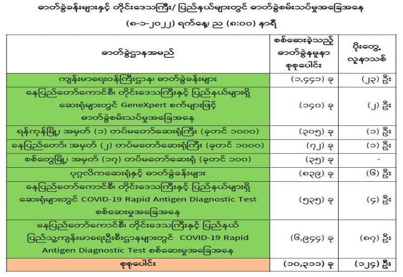 ကျန်းမာရေးဝန်ကြီးဌာနအနေဖြင့် နိုင်ငံအတွင်း ကူးစက်ဖြစ်ပွားနေသော COVID-19 ရောဂါ ကာကွယ်၊ ကုသ၊ ထိန်းချုပ်ရေးလုပ်ငန်းများကို အရှိန်အဟုန်မြှင့် ဆောင်ရွက်လျက်ရှိပါသည်။