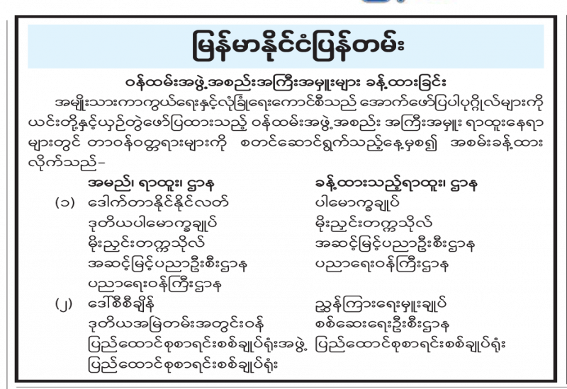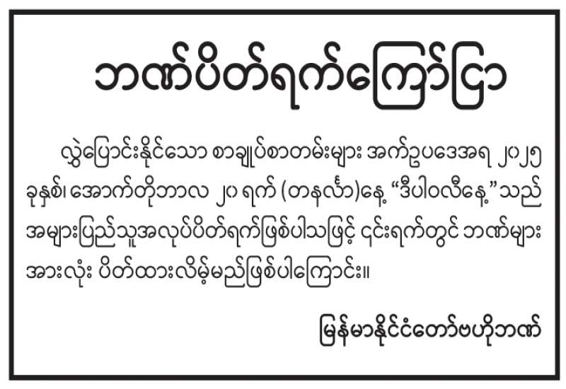 ပို့ဆောင်ရေးနှင့်ဆက်သွယ်ရေးဝန်ကြီးဌာန မြန်မာ့စာတိုက်လုပ်ငန်းမှ တိုင်းရင်းသားလူမျိုးများအလိုက်ထုတ်ဝေခဲ့ပြီးသောတံဆိပ်ခေါင်းများကို တံဆိပ်ခေါင်းစုဆောင်းသူဝါသနာရှင်များ တစ်စုတစ်စည်းတည်းစုဆောင်းနိုင်ကြရန်ရည်ရွယ်၍ တိုင်းရင်းသားလူမျိုးများစာပို့တံဆိပ်ခေါင်း ၂၀၀ ကျပ်တန် (၈)လုံးပါ Block of Stamp အထူးထုတ်စာပို့တံဆိပ်ခေါင်းသစ်တစ်မျိုးအား ၂၀၂၅ ခုနှစ် အောက်တိုဘာ ၂၀ ရက် မြန်မာသက္ကရာဇ် ၁၃၈၇ ခုနှစ် သီတင်းကျွတ်လပြည့်ကျော် ၁၄ ရက် (တနင်္လာနေ့) နံနက် ၉ နာရီခွဲမှစတင်၍ နေပြည်တော်ဗဟိုစာတိုက်ကြီး၊ ရန်ကုန်စာတိုက်ကြီး၊ မန္တလေးစာတိုက်ကြီးတို့နှင့် တိုင်းဒေသကြီး/ပြည်နယ်များရှိစာတိုက်ကြီးများတွင် တစ်ပြိုင်တည်းရောင်းချပေးသွားမည်ဖြစ်သည်။