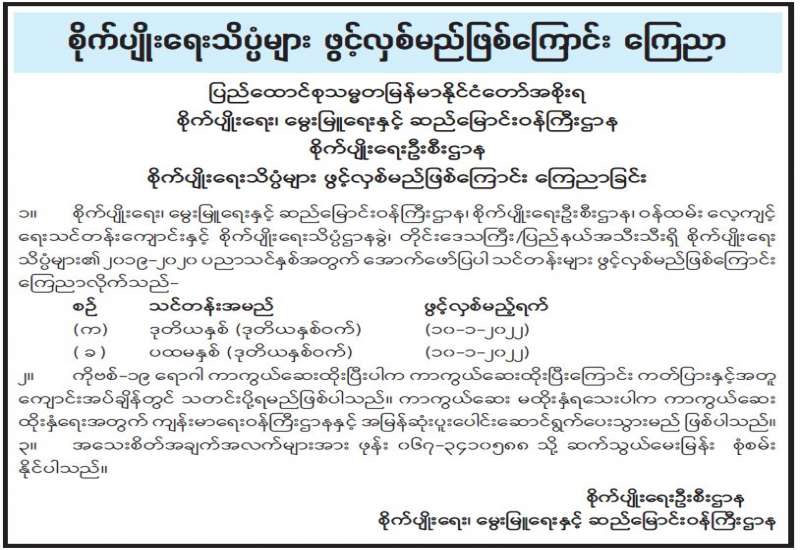စီးပွားရေးနှင့်ကူးသန်းရောင်းဝယ်ရေးဝန်ကြီးဌာန အနေဖြင့် ကိုဗစ်-၁၉ ရောဂါ ကာကွယ်၊ ထိန်းချုပ်၊ ကုသရေးဆိုင်ရာပစ္စည်းများကို လေကြောင်း၊ ပင်လယ်ရေကြောင်းနှင့် နယ်စပ်ကုန်သွယ်ရေး စခန်းများမှ နှောင့်နှေးကြန့်ကြာမှုမရှိ တင်သွင်းနိုင်ရေးအတွက် အချိန် နှင့်တပြေးညီစီစဉ်ဆောင်ရွက် ပေးလျက်ရှိရာ ယနေ့တွင် မြဝတီကုန်သွယ်ရေးဇုန်မှ ကုမ္ပဏီ (၁) ခု၊ ယာဉ်စီးရေ (၁) စီးဖြင့် အောက်ဆီဂျင် (အရည်) Bowser ယာဉ် (၁) စီးဖြင့် တန် (၂၀) တို့ကို တင်သွင်းခဲ့ကြောင်း သိရသည်။ အောက်စီဂျင် (အရည်) Bowser ယာဉ် (၁) စီးမှာ မြဝတီကုန်သွယ်ရေးဇုန်မှ ရန်ကုန်မြို့သို့ဖြစ်ကြောင်း သိရသည်။