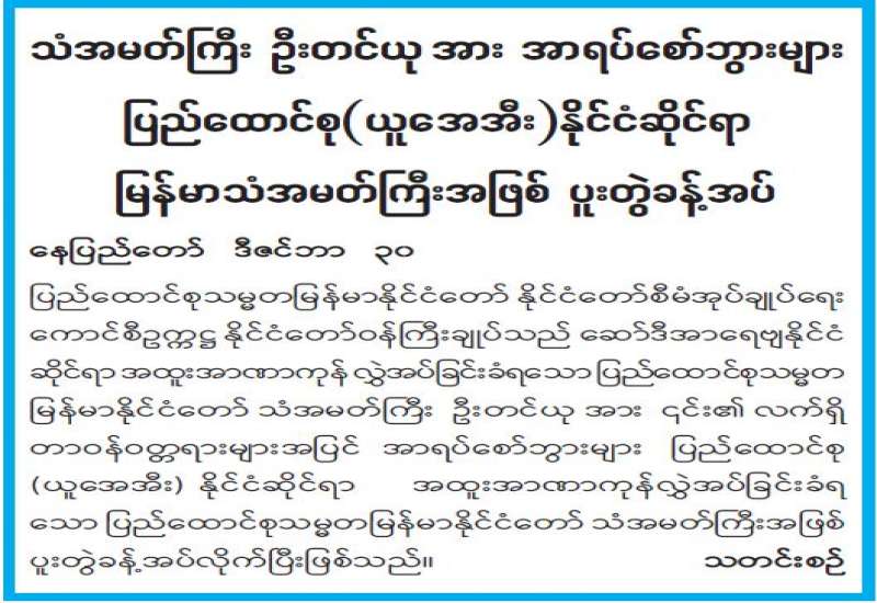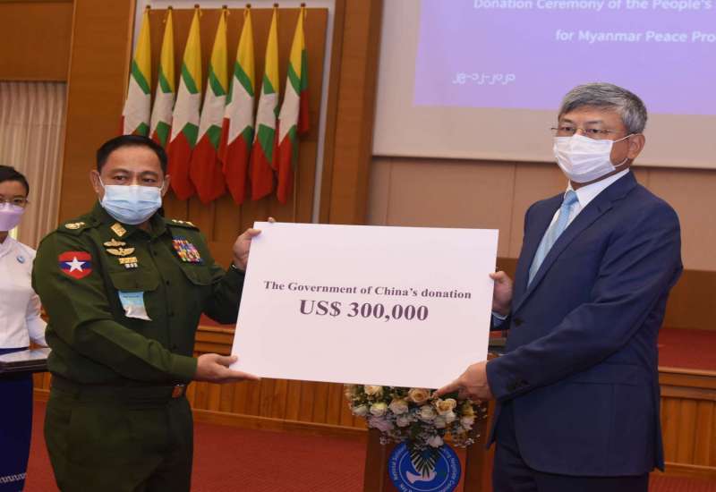မြန်မာနိုင်ငံ၏ ငြိမ်းချမ်းရေးလုပ်ငန်းစဉ်များ အကောင်အထည်ဖော်ဆောင်ရာတွင် အထောက်အကူပြုစေရန် ရည်ရွယ်၍ တရုတ်ပြည်သူ့သမ္မတနိုင်ငံအစိုးရမှ ထောက်ပံ့ငွေများ ပေးအပ်လှူဒါန်းခြင်း အခမ်းအနားကို ယနေ့နံနက်ပိုင်းက နေပြည်တော်ရှိ အမျိုးသားစည်းလုံးညီညွတ်ရေးနှင့် ငြိမ်းချမ်းရေးဖော်ဆောင်မှုဗဟိုဌာန၌ ကျင်းပသည်။