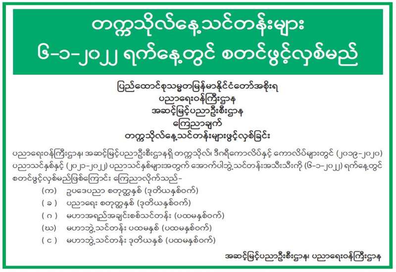 တက္ကသိုလ်နေ့သင်တန်းများ ၆-၁-၂၀၂၂ ရက်နေ့တွင် စတင်ဖွင့်လှစ်မည်