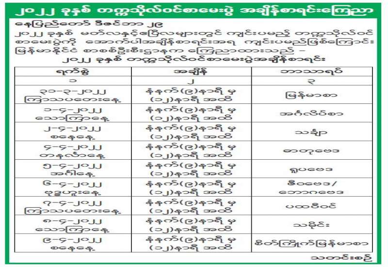 ၂၀၂၂ ခုနှစ် တက္ကသိုလ်ဝင်စာမေးပွဲ အချိန်စာရင်းကြေညာ