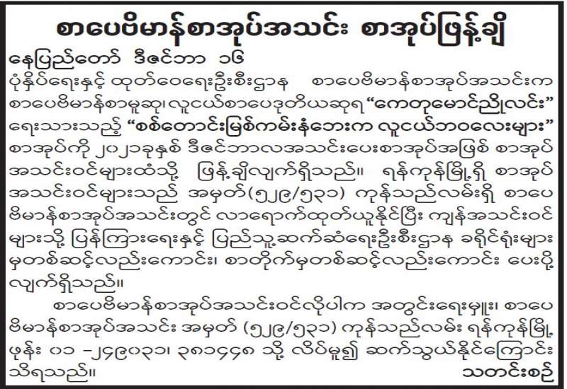 ပြည်သူ့ဘဏ္ဍာရေးစီမံခန့်ခွဲမှု အထူးမွမ်းမံသင်တန်းအမှတ်စဉ် (၁) သင်တန်းဆင်းပွဲကို ယနေ့ နံနက်ပိုင်းက စီမံကိန်းနှင့်ဘဏ္ဍာရေးဝန်ကြီးဌာန၊ ရသုံးမှန်းခြေငွေစာရင်းဦးစီးဌာန၊ ပြည်သူ့ဘဏ္ဍာရေးစီမံခန့်ခွဲမှု သင်တန်းကျောင်းတွင် ကိုဗစ်-၁၉ ရောဂါ ကာကွယ်ထိန်းချုပ်ရေး စည်းကမ်း သတ်မှတ်ချက်များနှင့်အညီ ကျင်းပသည်။