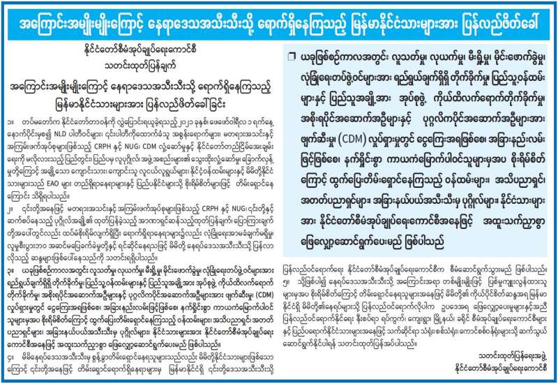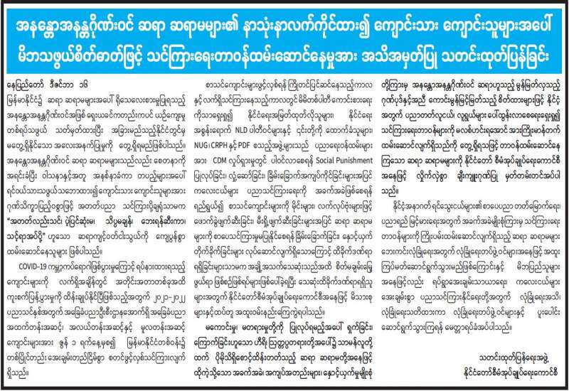 တိုင်းဒေသကြီးနှင့် ပြည်နယ်အသီးသီးတို့၌ သံဃာတော်များ၊ သာသနာနွယ်ဝင်သီလရှင်များ၊ ဘာသာရေးခေါင်းဆောင်များအပါအဝင် လူမျိုးမရွေး ဘာသာမရွေး အသက် ၄၀ နှစ်အထက် ဒေသခံပြည်သူများ၊ အကျဉ်းသား၊ အကျဉ်းသူများ၊ မသန်စွမ်းသူများ၊ တိုင်းရင်းသားလက်နက်ကိုင်အဖွဲ့များ၊ နာတာရှည်ရောဂါအခံရှိ သူများ၊ ကယ်ဆယ်ရေးစခန်းများ၊ ယာယီတိုက်ပွဲရှောင်စခန်းများအတွင်းရှိ ပြည်သူများ၊ အသက်(၁၂)နှစ်အထက် အခြေခံပညာအလယ်တန်းနှင့် အထက်တန်းအဆင့် ကျောင်း သား၊ ကျောင်းသူများစသည့် ဦးတည်အုပ်စုများသတ်မှတ်၍ တပ်မတော်မှ ဆေးအဖွဲ့ များ၊ ပြည်သူ့ဆေးရုံများမှ ဆရာဝန်များ၊ သူနာပြုများ၊ ကျန်းမာရေးဝန်ထမ်းများနှင့် စေတနာ့ဝန်ထမ်းများက ကာကွယ်ဆေးထိုးခြင်းလုပ်ငန်းများကို အင်တိုက်အားတိုက် ဆောင်ရွက်ပေးလျက်ရှိသည်။