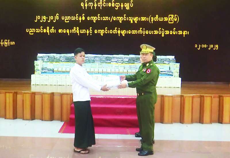 ၂၀၂၅−၂၀၂၆ ပညာသင်နှစ်တွင် တက်ရောက်ပညာသင်ကြားလျက်ရှိသည့် ရန်ကုန်တိုင်း စစ်ဌာနချုပ်နှင့် ကွပ်ကဲမှုအောက် တပ်ရင်း/တပ်ဖွဲ့များမှ တပ်မတော်သားမိသားစုဝင် ကျောင်းသား ကျောင်းသူများအား ဒုတိယအကြိမ် ပညာသင်စရိတ်၊ စာရေးကိရိယာနှင့် ကျောင်းဝတ်စုံများ ပေးအပ်ခြင်းကို ယနေ့နံနက်ပိုင်းတွင် တိုင်းစစ်ဌာနချုပ် အနော်ရထာခန်းမ၌ပြုလုပ်ရာ တိုင်းမှူး ဗိုလ်ချုပ် ပြည့်စုံလင်းနှင့် တာဝန်ရှိသူများ၊ အရာရှိ၊ စစ်သည်၊ မိသားစုများ၊ ကျောင်းသား ကျောင်းသူများ တက်ရောက်ကြသည်။
