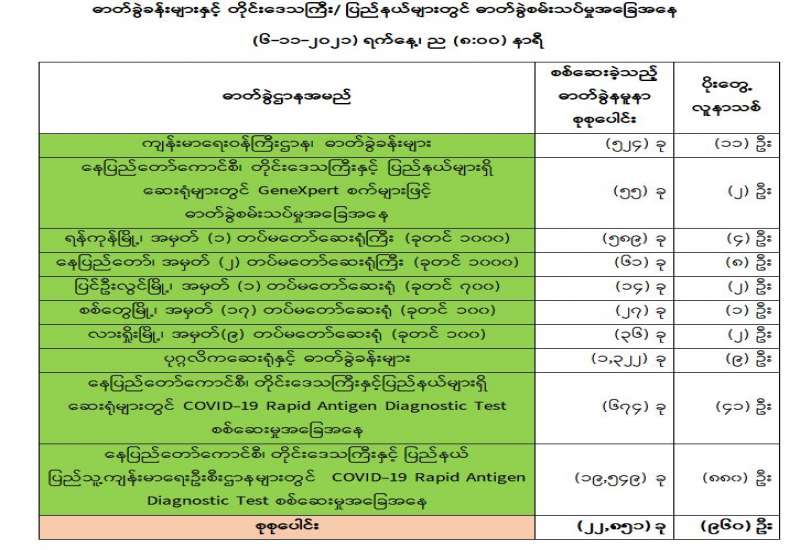 ကျန်းမာရေးဝန်ကြီးဌာနအနေဖြင့် နိုင်ငံအတွင်း ကူးစက်ဖြစ်ပွားနေသော COVID-19 ရောဂါ ကာကွယ်၊ ကုသ၊ ထိန်းချုပ်ရေးလုပ်ငန်းများကို အရှိန်အဟုန်မြှင့်ဆောင်ရွက်လျက်ရှိပါသည်။
