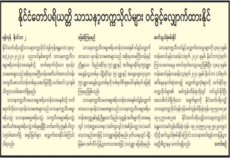 ပြန်ကြားရေးဝန်ကြီးဌာန ပုံနှိပ်ရေးနှင့် ထုတ်ဝေရေးဦးစီးဌာနက ပုံနှိပ်ထုတ်ဝေသော ၂၀၂၂ ခုနှစ် ရုံးသုံးပြက္ခဒိန်ကို ဖြန့်ချိရောင်းချနေပြီ ဖြစ်သည်။ ၂၀၂၂ ခုနှစ် ရုံးသုံးပြက္ခဒိန်ကို စက္ကူဖြူ၊ ချောဖြင့် တစ်စောင်လျှင် ငွေကျပ် ၅၀၀ နှုန်းဖြင့် စာပေဗိမာန်စာအုပ်ဆိုင် အမှတ် (တ-၅၅) သပြေကုန်းဈေး၊ နေပြည်တော် ဖုန်း- ၀၆၇-၃၄၁၄၆၈၁၊ စာပေဗိမာန်စာအုပ်ဆိုင် အမှတ် (၅၂၉/ ၅၃၁) ကုန်သည်လမ်း၊ ရန်ကုန်မြို့၊ ဖုန်း၀၁-၂၄၉၀၃၁၊ ၃၈၁၄၄၈၊ စာပေဗိမာန် စာအုပ်ဆိုင် အမှတ်-၁၅၉၊ ၈၆ လမ်း၊ ၂၁ လမ်းနှင့် ၂၂ လမ်းကြား၊ မန္တလေးမြို့ ဖုန်း၀၂-၄၀၃၀၁၈၆ နှင့် မြို့နယ်အသီးသီးရှိ စာပေဗိမာန် ကိုယ်စားလှယ်များထံ ဆက်သွယ်ဝယ်ယူရရှိနိုင်ပြီး ရုံးဌာန များနှင့်အသင်းအဖွဲ့များမှ လက်ကား ဝယ်ယူလိုပါက အမှတ် (၅၂၉/၅၃၁) ကုန်သည်လမ်း၊ ရန်ကုန်မြို့၊ ဖုန်း- ၀၁၂၄၉၀၃၁၊ ၃၈၁၄၄၈ တို့သို့ ဆက်သွယ် ဝယ်ယူနိုင်ကြောင်း သိရသည်။