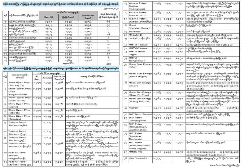 စီးပွားရေးနှင့် ကူးသန်းရောင်းဝယ်ရေးဝန်ကြီးဌာနနှင့် မြန်မာနိုင်ငံစက်သုံးဆီ တင်သွင်းဖြန့်ဖြူး ရောင်းချရေးအသင်းတို့ ပူးပေါင်းစီစဉ်မှုဖြင့် ပြည်သူများ သက်သာသောဈေးနှုန်းဖြင့် ဝယ်ယူရရှိနိုင်ရန်ရည်ရွယ်၍ ဗဟို ဘဏ်မှ ရည်ညွှန်းငွေလဲနှုန်းဖြင့် တိုက်ရိုက်ရောင်းချပေးသည့် နိုင်ငံခြားငွေဖြင့် မှာယူတင်သွင်းခဲ့သည့် စက်သုံးဆီများကို ၂၂.၉.၂၀၂၁ ရက်နေ့မှစတင်၍ တိုင်းဒေသကြီး/ပြည်နယ်များတွင် ရောင်းချပေးလျက်ရှိပြီး 92 Ron ၁၉၈၄၀၃၉၉ လီတာ၊ ဒီဇယ် ၁၂၈၆၉၄၄၁ လီတာနှင့် Premium ဒီဇယ်၁၈၆၂၇၅၇၁လီတာတို့ဖြန့်ဖြူး ရောင်းချပေးထားပြီး ဖြစ်သည်။