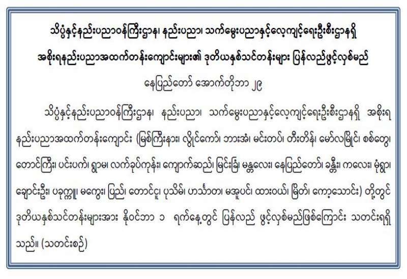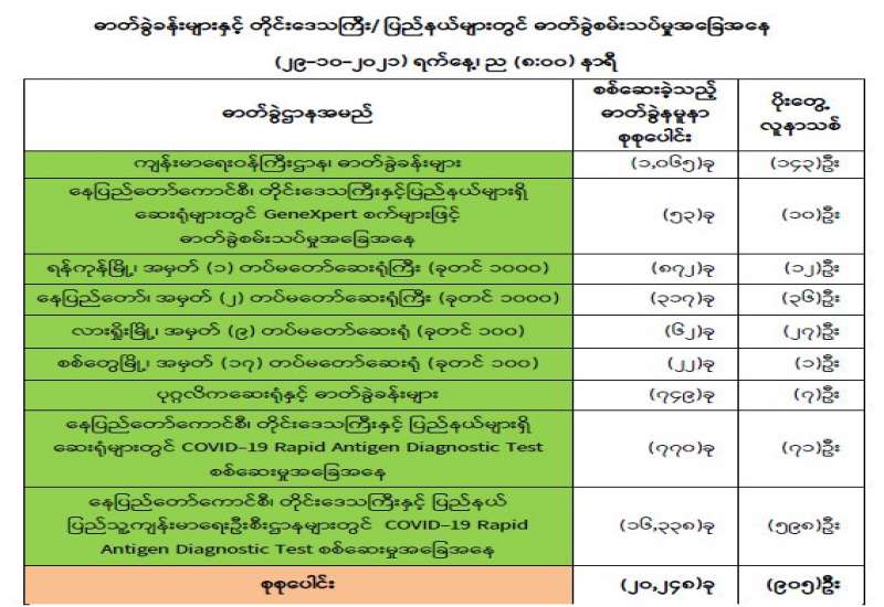 ကျန်းမာရေးဝန်ကြီးဌာနအနေဖြင့် နိုင်ငံအတွင်း ကူးစက်ဖြစ်ပွားနေသော COVID-19 ရောဂါ ကာကွယ်၊ ကုသ၊ ထိန်းချုပ်ရေးလုပ်ငန်းများကို အရှိန်အဟုန်မြှင့်ဆောင်ရွက်လျက်ရှိရာ ရောဂါ ထိန်းချုပ်ရေးလုပ်ငန်းများ အောင်မြင်နိုင်ရေးအတွက် ပြည်သူလူထုအနေဖြင့် ကျန်းမာရေး ဝန်ကြီးဌာနမှ ထုတ်ပြန်ထားသော COVID-19 ရောဂါ ကာကွယ်ထိန်းချုပ်ရေးဆိုင်ရာ စည်းကမ်း များကို စနစ်တကျ လိုက်နာဆောင်ရွက်ရန်လိုအပ်ပြီး COVID-19 ကာကွယ်ဆေးထိုးနှံမှု ခံယူခြင်းအား အထူးဂရုပြု ပူးပေါင်းဆောင်ရွက်ကြရန် လိုအပ်ပါသည်။