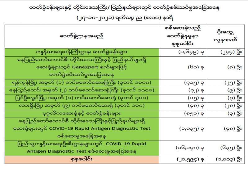 စီးပွားရေးနှင့် ကူးသန်းရောင်းဝယ်ရေးဝန်ကြီးဌာနအနေဖြင့် ကိုဗစ်-၁၉ ရောဂါ ကာကွယ်၊ ထိန်းချုပ်၊ ကုသရေးဆိုင်ရာပစ္စည်းများကို လေကြောင်း၊ ရေကြောင်းနှင့် နယ်စပ်ကုန်သွယ်ရေး စခန်းများမှ နှောင့်နှေးကြန့်ကြာမှုမရှိ တင်သွင်းနိုင်ရေးအတွက်အချိန်နှင့် တစ်ပြေးညီ စီစဉ်ဆောင်ရွက်ပေးလျက်ရှိရာ ယနေ့တွင် ရန်ကုန်အပြည်ပြည်ဆိုင်ရာ ဆိပ်ကမ်းနှင့် ချင်းရွှေဟော်ကုန်သွယ်ရေး စခန်းတို့မှ တင်သွင်းရာ၌ ကုမ္ပဏီ (၁)ခုမှ ယာဉ်စီးရေ (၂)စီးဖြင့်၊ အောက်ဆီဂျင်အိုးခွံ(၁၈၅၀)၊ လုပ်ငန်းသုံး အောက်ဆီဂျင်စက် (Oxygen Generator) (၁)ခု၊ အိမ်သုံးအောက်ဆီဂျင်စက်(Oxygen Concentrator) (၁၁)ခု၊ PPE ဝတ်စုံ (၄၀,၆၀၀) ၊ လက်အိတ်တန် (၂၀)တို့ကို တင်သွင်းခဲ့ကြောင်း သိရသည်။