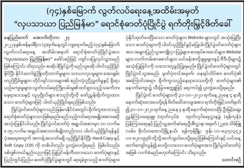 ကျန်းမာရေးဝန်ကြီးဌာနအနေဖြင့် နိုင်ငံအတွင်း ကူးစက်ဖြစ်ပွားနေသော COVID-19 ရောဂါ ကာကွယ်၊ ကုသ၊ ထိန်းချုပ်ရေး လုပ်ငန်းများကို အရှိန်အဟုန်မြှင့်ဆောင်ရွက်လျက်ရှိရာ ရောဂါ ထိန်းချုပ်ရေးလုပ်ငန်းများ အောင်မြင်နိုင်ရေးအတွက် ပြည်သူလူထုအနေဖြင့် ကျန်းမာရေးဝန်ကြီးဌာနမှ ထုတ်ပြန်ထားသော COVID-19 ရောဂါကာကွယ် ထိန်းချုပ်ရေးဆိုင်ရာ စည်းကမ်းများကို စနစ်တကျ လိုက်နာဆောင်ရွက်ရန်လိုအပ်ပြီး COVID-19 ကာကွယ်ဆေး ထိုးနှံမှုခံယူခြင်းအား အထူးဂရုပြု ပူးပေါင်းဆောင်ရွက်ကြရန် လိုအပ်ပါသည်။