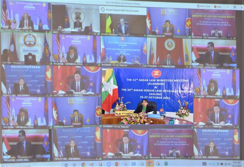 (၁၁) ကြိမ်မြောက် အာဆီယံဥပဒေရေးရာဝန်ကြီးများ အစည်းအဝေး (ALAWMM) ကို ယနေ့ နံနက်ပိုင်းတွင် ဗီဒီယိုကွန်ဖရင့် စနစ်ဖြင့်ကျင်းပရာ အစည်းအဝေးသို့ ဥပဒေရေးရာဝန်ကြီးဌာန ပြည်ထောင်စုဝန်ကြီးနှင့် ပြည်ထောင်စုရှေ့နေချုပ် ဒေါက်တာသီတာဦး ဦးဆောင်သော မြန်မာကိုယ်စားလှယ်အဖွဲ့ တက်ရောက်ကြသည်။