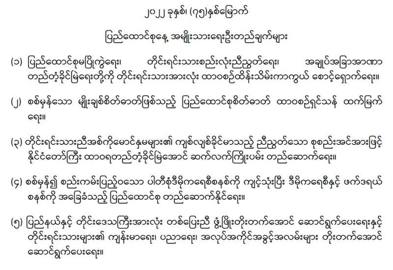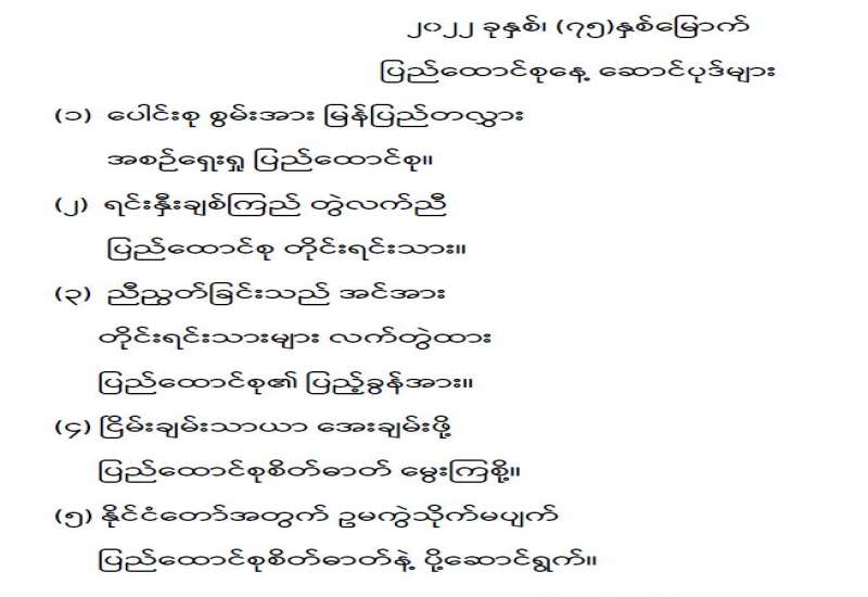 ၂၀၀၈ ခုနှစ် ဖွဲ့စည်းပုံအခြေခံဉပဒေနှင့်အညီ ဆောင်ရွက်လျက်ရှိသည့် နိုင်ငံတော်စီမံအုပ်ချုပ်ရေး ကောင်စီအား ထောက်ခံပွဲကို ယနေ့တွင် ရှမ်းပြည်နယ် (မြောက်ပိုင်း)၊ ကွမ်းလုံမြို့၊ လောက်ကိုင်မြို့နှင့် မိုင်းရယ်မြို့တို့၌ လည်းကောင်း၊ ရှမ်းပြည်နယ်(တောင်ပိုင်း)၊ ရပ်စောက်မြို့နယ်နှင့် လွိုင်လင်မြို့တို့၌ လည်းကောင်း၊ ရှမ်းပြည်နယ်(အရှေ့ပိုင်း)၊ မိုင်းတုံမြို့၌ လည်းကောင်း၊ တနင်္သာရီတိုင်းဒေသကြီး၊ ထားဝယ်မြို့နှင့် မြိတ်မြို့တို့၌လည်းကောင်း၊ ဧရာဝတီတိုင်းဒေသကြီး၊ ပုသိမ်မြို့၌ လည်းကောင်း၊ ရခိုင်ပြည်နယ်၊ တောင်ကုတ်မြို့၊ ကျောက်ဖြူမြို့နှင့် ဂွမြို့တို့၌ လည်းကောင်း၊ စစ်ကိုင်းတိုင်းဒေသကြီး၊ မော်လိုက်မြို့၌ လည်းကောင်း၊ ပဲခူးတိုင်း ဒေသကြီး၊ ရေတာရှည်မြို့၊ အုတ်တွင်းမြို့၊ ပေါက်ခေါင်းမြို့တို့၌ လည်းကောင်း အသီးသီးပြုလုပ်ကြပြီး ဆန္ဒဖော်ထုတ်ခဲ့ကြသည်။