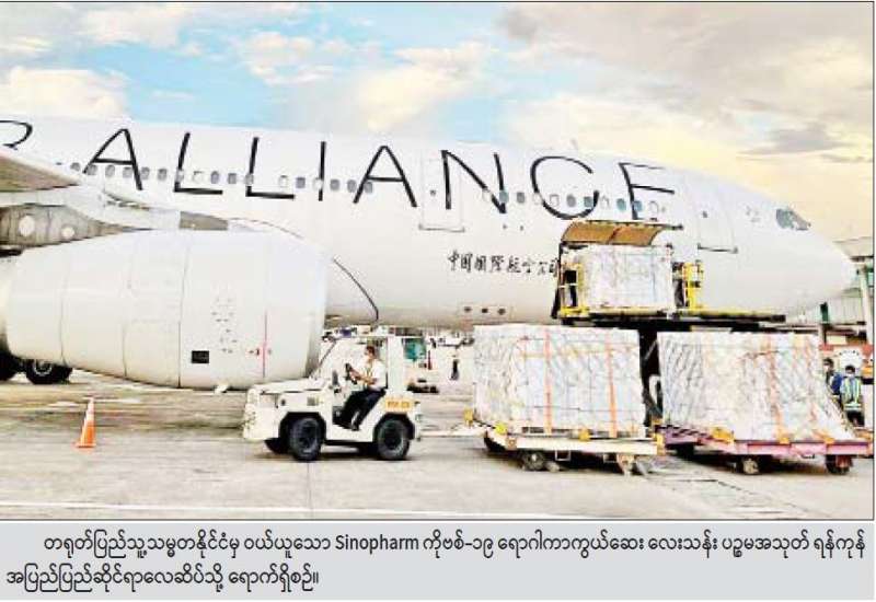 တရုတ်ပြည်သူ့သမ္မတနိုင်ငံ၊ဘေဂျင်းမြို့ Sinopharm ကုမ္ပဏီမှဝယ်ယူသော Sinopharm (BIBP) ကိုဗစ်-၁၉ ကာကွယ် ဆေး(၄)သန်း (5 doses per Vial ထုတ်ပိုးမှုပုံစံ) ဆေးအလုံး ရေ(၈)သိန်းတင်ဆောင်လာသော Air China လေကြောင်း လိုင်း A 332 အမျိုးအစား လေကြောင်းပျံ သန်းအမှတ် CA 589 လေယာဉ်သည်တရုတ်နိုင်ငံ ပေကျင်းမြို့ မှ ယနေ့ ညနေ ပိုင်းတွင် ရန်ကုန်အပြည်ပြည်ဆိုင်ရာလေဆိပ်သို့ ပဥ္စမအသုတ်အဖြစ် ရောက်ရှိလာကြောင်း သိရသည်။