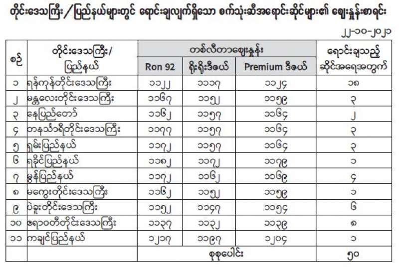 စီးပွားရေးနှင့် ကူးသန်းရောင်းဝယ်ရေးဝန်ကြီးဌာနနှင့် မြန်မာနိုင်ငံ စက်သုံးဆီတင်သွင်း ဖြန့်ဖြူး ရောင်းချရေးအသင်းတို့ ပူးပေါင်းစီစဉ်မှုဖြင့် ပြည်သူများသက်သာသောဈေးနှုန်းဖြင့် ဝယ်ယူ ရရှိနိုင်ရန် ရည်ရွယ်၍ ဗဟိုဘဏ်မှ ရည်ညွှန်း ငွေလဲနှုန်းဖြင့် တိုက်ရိုက်ရောင်းချပေးသည့် နိုင်ငံ ခြားငွေဖြင့် မှာယူတင်သွင်းခဲ့သည့် စက်သုံးဆီများကို ယနေ့မှစတင်၍ တိုင်းဒေသကြီး/ ပြည်နယ်များရှိ စက်သုံးဆီအရောင်းဆိုင် ၅၀ တွင် 92 Ron ၁၉၆၇၀၆၅၂ လီတာ၊ ဒီဇယ် ၁၂၂၀၅၉၀၆ လီတာနှင့် Premium ဒီဇယ် ၁၈၃၄၇၁၀၁ လီတာတို့ ဖြန့်ဖြူး ရောင်းချ ပေးထားပြီးဖြစ်သည်။