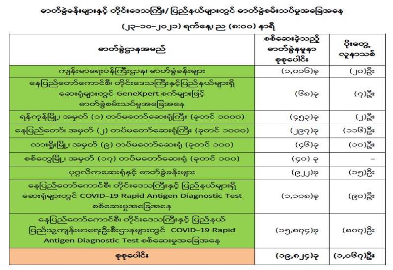 ကိုဗစ်-၁၉ ရောဂါနှင့်ပတ်သက်၍ အောက်တိုဘာ ၁၆ ရက်တွင် ဓာတ်ခွဲအတည်ပြု လူန၁သစ် ၁၂၀၅ ဦးတွေ့ရှိပြီး ပိုးတွေ့ရာခိုင်နှုန်း ၆ ဒသမ ၈ ရာခိုင်နှုန်း၊ အောက်တို ဘာ ၁၈ ရက်တွင် ဓာတ်ခွဲအတည်ပြုလူနာသစ် ၁၀၂ ဦးတွေ့ရှိပြီး ရောဂါပိုးတွေ့ ရာခိုင်နှုန်း ၆ ဒသမ၂၁ ရာခိုင် နှုန်းနှင့် အောက်တိုဘာ ၂၁ ရက်တွင် ဓာတ်ခွဲအတည် ပြုလူနာသစ် ၆၈၃ ဦးတွေ့ရှိပြီး ရောဂါ ပိုးတွေ့ရာခိုင်နှုန်း ၄ ဒသမ ၉၅ ရာခိုင်နှုန်း တွေ့ရှိခဲ့သည်။