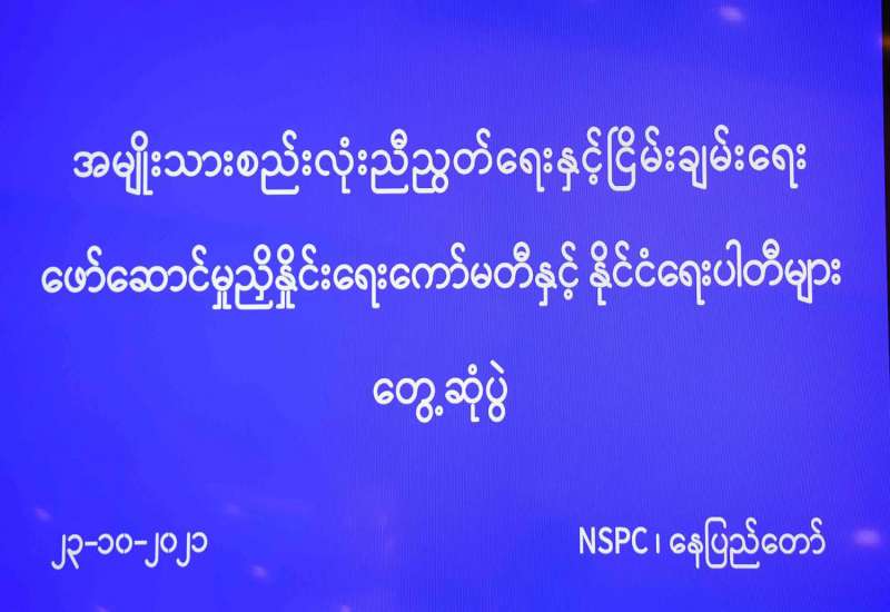 အမျိုးသားစည်းလုံးညီညွတ်ရေးနှင့် ငြိမ်းချမ်းရေးဖော်ဆောင်မှု ညှိနှိုင်းရေးကော်မတီ (NSPC) နှင့် နိုင်ငံရေးပါတီများ တွေ့ဆုံ ဆွေးနွေးပွဲကို ယနေ့နံနက်ပိုင်းက နေပြည်တော်ရှိ အမျိုးသား စည်းလုံးညီညွတ်ရေးနှင့် ငြိမ်းချမ်းရေးဖော်ဆောင်မှုဗဟိုဌာန အစည်းအဝေးခန်းမ၌ကျင်းပသည်။
