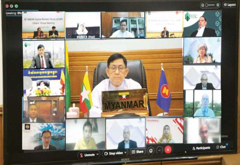(၃၅) ကြိမ်မြောက် အာဆီယံအရင်းအနှီးဈေးကွက် ဥက္ကဋ္ဌများအစည်းအဝေး (35th Chairs' Meeting of the ASEAN Capital Markets Forum) ကို ယနေ့ နံနက် ၇ နာရီခွဲတွင် ဗီဒီယိုကွန်ဖရင့်စနစ်ဖြင့် ကျင်းပရာ မြန်မာနိုင်ငံမှ စီမံကိန်းနှင့်ဘဏ္ဍာရေးဝန်ကြီးဌာန ဒုတိယဝန်ကြီးနှင့် ငွေချေးသက်သေခံ လက်မှတ်လုပ်ငန်း ကြီးကြပ်ရေးကော်မရှင် ဥက္ကဋ္ဌ ဦးမောင်မောင်ဝင်း၊ ကော်မရှင်အဖွဲ့ဝင်များနှင့် ငွေချေးသက်သေခံလက်မှတ် လုပ်ငန်းကြီးကြပ်ရေးကော်မရှင်ရုံးမှ ညွန်ကြားရေးမှူးချုပ်တို့ ပါဝင်တက်ရောက်ကြသည်။