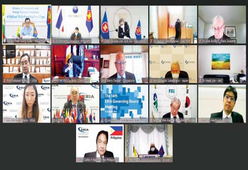 (၁၄) ကြိမ်မြောက် အာဆီယံနှင့် အရှေ့အာရှ စီးပွားရေးသုတေသနဌာန (ERIA) အုပ်ချုပ်မှုဘုတ်အဖွဲ့ အစည်း အဝေးကို ယနေ့ မွန်းလွဲပိုင်းက ဗီဒီယိုကွန်ဖရင့်စနစ်ဖြင့် ကျင်းပရာ မြန်မာနိုင်ငံ၏ အီးအာရ်အိုင်အေအုပ်ချုပ်မှု ဘုတ်အဖွဲ့ဝင်၊ ရင်းနှီးမြှုပ်နှံမှုနှင့် နိုင်ငံခြားစီးပွား ဆက်သွယ်ရေးဝန်ကြီးဌာန ဒုတိယဝန်ကြီး ဦးသန်း အောင်ကျော်သည် ရင်းနှီးမြှုပ်နှံမှုနှင့် နိုင်ငံခြားစီးပွားဆက်သွယ်ရေး ဝန်ကြီးဌာနမှ ပါဝင်တက်ရောက်သည်။