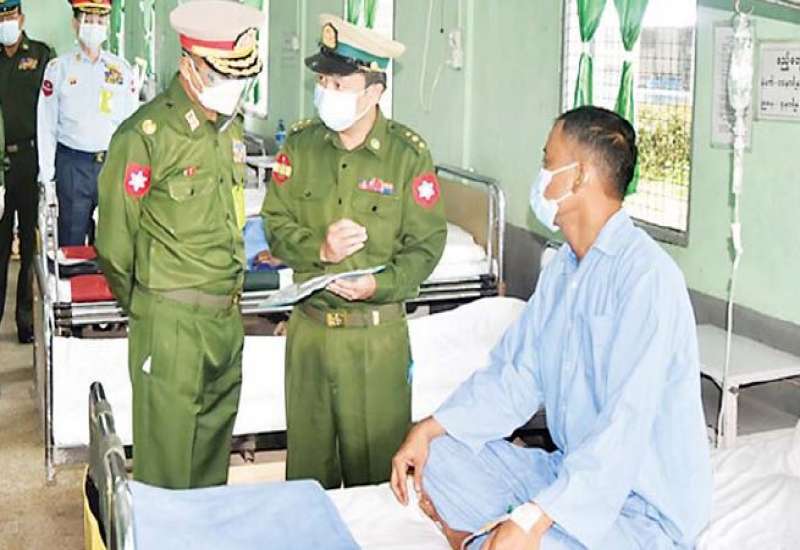 ဧရာဝတီတိုင်းဒေသကြီး ပုသိမ်မြို့ရှိ တပ်မတော်ဆေးရုံ၌ တက်ရောက်ကုသမှုခံယူလျက်ရှိသော အရာရှိ၊ စစ်သည်၊ မိသားစုများနှင့် ဒေသခံပြည်သူများကို ယနေ့မွန်းလွဲပိုင်းတွင် အနောက်တောင်တိုင်း စစ်ဌာနချုပ်တိုင်းမှူး ဗိုလ်ချုပ် အောင်အောင်နှင့် အဖွဲ့ဝင်များက သွားရောက်ကြည့်ရှု၍ တစ်ဦးချင်း၏ ရောဂါဖြစ်ပွားမှု၊ ဆေးကုသပေး ထားမှုနှင့် ကျန်းမာရေး တိုးတက်မှုအခြေအနေများကို ရင်းရင်းနှီးနှီး မေးမြန်း အားပေးစကားပြောကြားပြီး စားသောက် ဖွယ်ရာများပေးအပ်သည်။