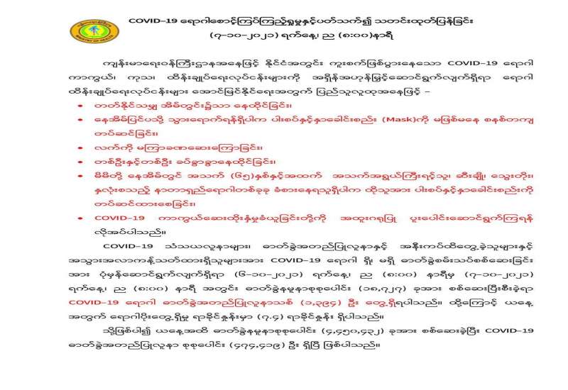 နိုင်ငံတော်အတွင်း၌ ကိုဗစ်-၁၉ ရောဂါကာကွယ်၊ ထိန်းချုပ်၊ ကုသရေးဆိုင်ရာ ပစ္စည်းများကို လေကြောင်း၊ ရေကြောင်းနှင့် နယ်စပ်ကုန်သွယ်ရေး စခန်းများမှ အဆင်ပြေချောမွေ့စွာ တင်သွင်းနိုင်ရေးအတွက် စီးပွားရေးနှင့် ကူးသန်းရောင်းဝယ်ရေးဝန်ကြီးဌာနက အခြားဆက်စပ် ဌာနများနှင့် လိုအပ်သည်များ ပူးပေါင်းဆောင်ရွက်ပေးလျက်ရှိရာ ယနေ့တွင် ရန်ကုန် အပြည်ပြည်ဆိုင်ရာ ဆိပ်ကမ်းများနှင့် ချင်းရွှေဟော်၊ မြဝတီကုန်သွယ်ရေး စခန်းနှစ်ခုတို့မှ တင်သွင်းရာ၌ ကုမ္ပဏီနှစ်ခုမှယာဉ်စီးရေနှစ်စီးဖြင့် အောက်ဆီဂျင်(အိုးခွံ) ၂၁၉၀ နှင့် အောက်ဆီဂျင်ထုတ်စက် နှစ်ခုတင်သွင်းခဲ့သည်။ အောက်ဆီဂျင်ထုတ်စက် နှစ်ခုမှာ ရန်ကုန်မြို့ နှင့် ကျုံဒိုးမြို့သို့ တစ်ခုစီဖြစ်ကြောင်း သိရသည်။