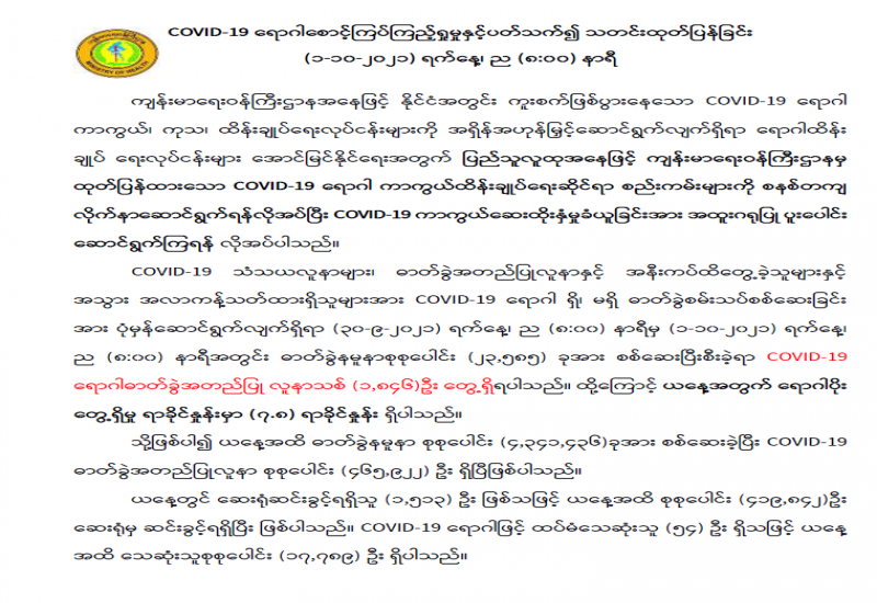 ကိုဗစ်-၁၉ ရောဂါ ဓာတ်ခွဲအတည်ပြု ပိုးတွေ့လူနာများနှင့် သီးသန့်စောင့် ကြည့်ရမည့်သူများကို ကုသရေးလုပ်ငန်းများ ဆောင်ရွက်ရာတွင် အောက်ဆီဂျင် လိုအပ်ချက်များကို တစ်ဖက် တစ်လမ်းမှ အထောက်အကူပြုစေရန်အတွက် ကျန်းမာရေးဝန်ကြီးဌာနမှ Oxygen Plant များကို တိုးမြှင့်တပ်ဆင် လည်ပတ်လျက်ရှိပြီး တပ်မတော်အနေဖြင့်လည်း တိုင်းစစ်ဌာနချုပ် နယ်မြေအသီးသီးတွင် Oxygen Plant များကို တပ်ဆင်ထုတ်လုပ်ပေးလျက်ရှိသည်။