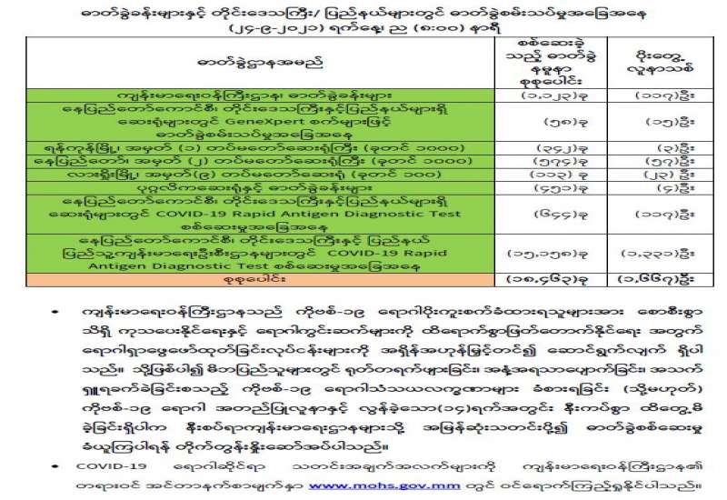 ကိုဗစ်-၁၉ ရောဂါကူးစက်မှုနှုန်း ၈ ရာခိုင်နှုန်းနှင့် ၉ ရာခိုင်နှုန်း ဝန်းကျင်သို့ ကျဆင်းသွားခဲ့ပြီ ဖြစ်သော်လည်း စိတ်ချရသည့် အခြေအနေသို့ မရောက်သေး။ တစ်နိုင်ငံလုံး ပျမ်းမျှခြင်းအားဖြင့် ကူးစက်မှုနှုန်း ကျဆင်းသည်ဟုဆိုနိုင်သည့်တိုင်အောင် တိုင်းဒေသကြီးနှင့် ပြည်နယ်အချို့၊ နယ်စပ်ဒေသများ စသည်တို့တွင် ကူးစက်မှုနှုန်း များနေဆဲဖြစ်သည်။ ကိုဗစ်-၁၉ ကာကွယ် ထိန်းချုပ်ရေးတွင် ရောဂါ ကာကွယ်ဆေးထိုးနှံပေးမှုသည် လွန်စွာအရေးပါသည့်အလျောက် ကိုဗစ်-၁၉ ရောဂါ ကာကွယ်ဆေးထိုးနှံမှုများကို အရှိန်အဟုန်မပျက် ဆောင်ရွက်လျက်ရှိရာ ကာကွယ်ဆေးထိုးနှံပြီးသူ ဦးရေစုစုပေါင်း ၁၀ သန်းခန့် ရှိလာပြီဖြစ်သည်။
