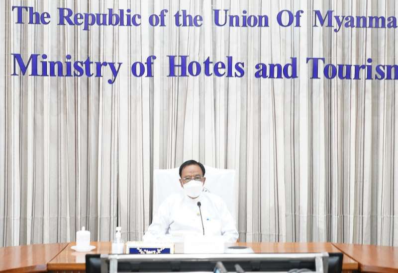 ဟိုတယ်နှင့်ခရီးသွားလာရေးဝန်ကြီးဌာန၊ ပြည်ထောင်စုဝန်ကြီး ဒေါက်တာဌေးအောင်သည် ကမ္ဘာ့ခရီးသွားလုပ်ငန်းနေ့ (၂၀၂၁) အထိမ်းအမှတ်အခမ်းအနား အောင်မြင်စွာကျင်းပနိုင်ရေး အပြီးသတ် စီစဉ်ဆောင်ရွက်ထားရှိမှုများနှင့်စပ်လျဉ်း၍ လုပ်ငန်းညှိနှိုင်း အစည်းအဝေးကို ယနေ့ မွန်းလွဲပိုင်းက ဗီဒီယိုကွန်ဖရင့်စနစ်ဖြင့် ဝန်ကြီးဌာန နီလာအစည်းအဝေးခန်းမ၌ ကျန်းမာရေး ဝန်ကြီးဌာနမှ ထုတ်ပြန်ထားရှိသည့် ကိုဗစ်-၁၉ ရောဂါကာကွယ်၊ ထိန်းချုပ်ရေးဆိုင်ရာ ညွှန်ကြားချက်များနှင့်အညီ ကျင်းပသည်။