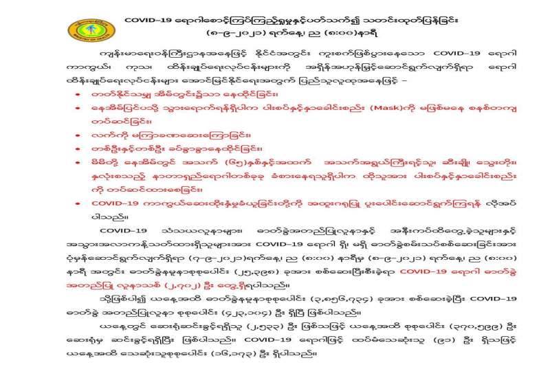 ကိုဗစ်-၁၉ ရောဂါအတည်ပြု လူနာများနှင့် သီးသန့်စောင့်ကြည့်ရမည့် သူများထားရှိရန် တိုင်းစစ်ဌာနချုပ် နယ်မြေအသီးသီးရှိ တပ်မတော်ဆေးရုံများ၊ နယ်မြေခံသင်တန်းကျောင်းများ၊ စစ်ကြောရေးနှင့် တည်းခိုရေးစခန်းများ၌ ကြိုတင်ပြင်ဆင်မှုများ လုပ်ဆောင်လျက်ရှိပြီး ပြီးစီးသည့်နေရာများတွင် စနစ်တကျလက်ခံ၍ ကျန်းမာရေး စောင့်ရှောက်မှုလုပ်ငန်းများ ဆောင်ရွက်ပေးလျက်ရှိသည်။ ထို့ပြင် ကျန်းမာရေးဝန်ကြီးဌာနနှင့် အခြားဌာနဆိုင်ရာ တာဝန်ရှိသူများ၊ ပရဟိတအဖွဲ့အစည်းများ၊ တာဝန်သိပြည်သူများနှင့် ပူးပေါင်း၍လည်း သက်ဆိုင်ရာ မြို့နယ်များ၌ Quarantine Center များကိုလည်း ပြင်ဆင် ဆောင်ရွက်လျက် ရှိသည်။