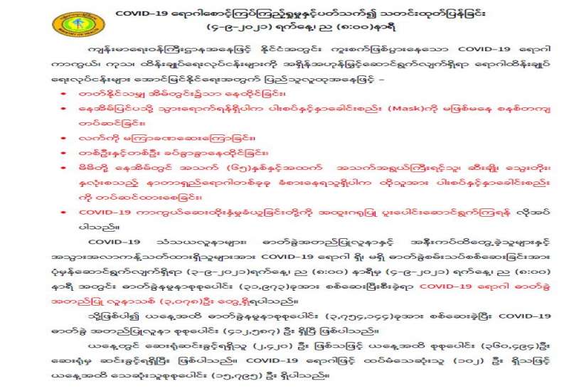 ပြည်သူလူထုအတွင်း ကိုဗစ်-၁၉ ရောဂါ ကူးစက်မှုမရှိစေရေးအတွက် ကျန်းမာရေးဝန်ကြီးဌာနက ထုတ်ပြန်ထားသည့် ကိုဗစ်-၁၉ရောဂါ ကာကွယ် ထိန်းချုပ်ရေး အမိန့်ကြေညာချက်များ၊ ညွှန်ကြားချက်များ၊ လုပ်ငန်းလမ်းညွှန်များအတိုင်းတိကျစွာ လိုက်နာဆောင်ရွက်သွားရန် အထူးအရေးကြီးကြောင်း ကျန်းမာရေးဝန်ကြီးဌာနက သတင်း ထုတ်ပြန်တိုက်တွန်းထားသည်။