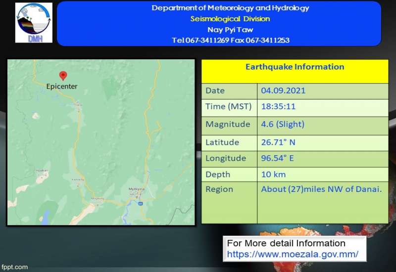 ၂၀၂၁ ခုနှစ်၊ စက်တင်ဘာလ (၄)ရက်နေ့၊ မြန်မာစံတော်ချိန် (၁၈)နာရီ၊ (၃၅)မိနစ်၊ (၁၁)စက္ကန့် အချိန်တွင် မြစ်ကြီးနားမြေငလျင်စခန်းမှ အနောက်မြောက်ဘက် မိုင်(၁၀၀) ခန့်ကွာဝေးသော မြန်မာနိုင်ငံပြည်တွင်း (တနိုင်းမြို့၏ အနောက်မြောက်ဘက် (၂၇)မိုင်ခန့်အကွာ)၊ မြောက်လတ္တီတွဒ် (၂၆.၇၁)ဒီဂရီ၊ အရှေ့လောင်ဂျီတွဒ် (၉၆.၅၄)ဒီဂရီ၊ အနက် (၁၀)ကီလိုမီတာကို ဗဟိုပြု၍ အင်အား ရစ်(ခ်)တာစကေး (၄.၆)အဆင့်ရှိ အင်အားအနည်းငယ်ရှိသော မြေငလျင်တစ်ခု လှုပ်ရှားသွားကြောင်း တိုင်းထွာရရှိပါသည်။