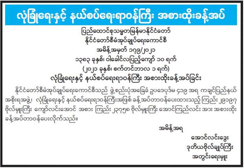 ရန်ကုန်မြို့တော် စည်ပင်သာယာရေးကော်မတီ၊ ကိုဗစ်-၁၉ ကာကွယ်၊ ထိန်းချုပ်၊ ကုသရေးကော်မတီသို့ သတ္တမအကြိမ် အလှူငွေပေးအပ်ပွဲ အခမ်းအနားကို ယနေ့နံနက် ၉ နာရီက ရန်ကုန်မြို့တော် စည်ပင် သာယာရေးကော်မတီ မြို့တော်ခန်းမ၌ ကျင်းပသည်။