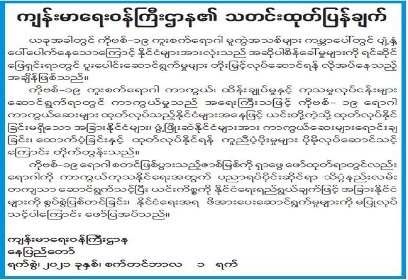 ကျန်းမာရေးဝန်ကြီးဌာနအနေဖြင့် နိုင်ငံအတွင်း ကူးစက်ဖြစ်ပွားနေသော COVID-19 ရောဂါကာကွယ်၊ ကုသ၊ ထိန်းချုပ်ရေးလုပ်ငန်းများကို အရှိန်အဟုန်မြှင့်ဆောင်ရွက်လျက်ရှိရာ ရောဂါထိန်းချုပ်ရေးလုပ်ငန်းများ အောင်မြင်နိုင်ရေးအတွက် ပြည်သူလူထုအနေဖြင့် -