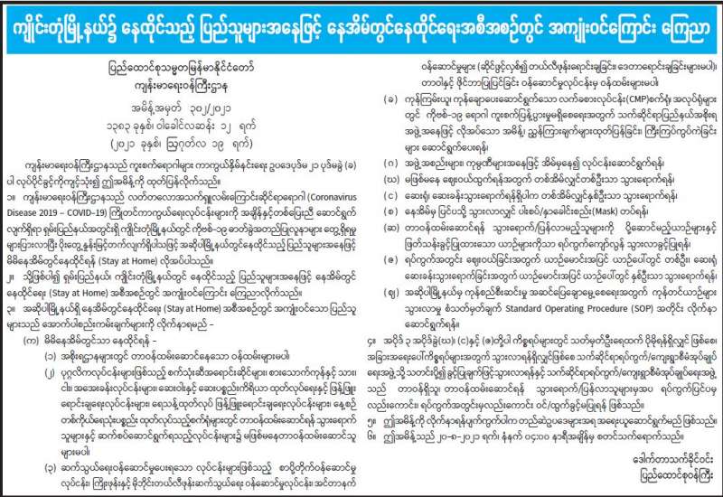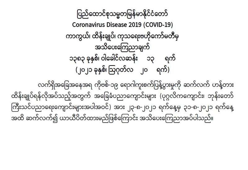 မြန်မာ့အသံနှင့် ရုပ်မြင်သံကြားမှ ဩဂုတ် ၁၈ ရက် ည ၈ နာရီ သတင်းအပြီးတွင် ထုတ်လွှင့်ပြသခဲ့သည့် ကိုဗစ်-၁၉ ရောဂါကာကွယ်ထိန်းချုပ်ရေးဆိုင်ရာ ဆောင်ရွက်ချက်များအကြောင်း သိကောင်းစရာ အစီအစဉ်ကို ပြည်သူများ သိရှိနိုင်ရန်အတွက် ပြန်လည်ဖော်ပြလိုက်ပါသည်။