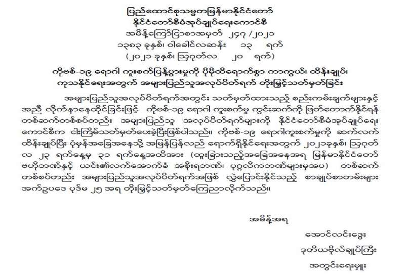 မြန်မာနိုင်ငံတစ်ဝန်း ကိုဗစ်-၁၉ ရောဂါ (တတိယလှိုင်း) ကူးစက်နှုန်း မြင့်မားနေချိန်တွင် နိုင်ငံတော်စီမံအုပ်ချုပ်ရေးကောင်စီအနေဖြင့် ပြည်သူလူထုနှင့်ပူးပေါင်းပြီး ရောဂါ ကာကွယ်၊ ထိန်းချုပ်၊ ကုသရေး လုပ်ငန်းများအား ဘက်ပေါင်းစုံမှ အစွမ်းကုန် ဆောင်ရွက်လျက်ရှိပါ သည်။ မိဘပြည်သူများအနေဖြင့်လည်း ကိုဗစ်ရောဂါ အန္တရာယ် အတွက်စိုးရိမ်ပူပန်နေကြရသလို ကျန်းမာရေးဝန်ကြီးဌာန၏သတ်မှတ် ချက်များနှင့်အညီ ကိုဗစ်-၁၉ ရောဂါအား တက်ကြွစွာ ပူးပေါင်းကာ ကွယ်တိုက်ဖျက်လျက်ရှိပါသည်။ ။