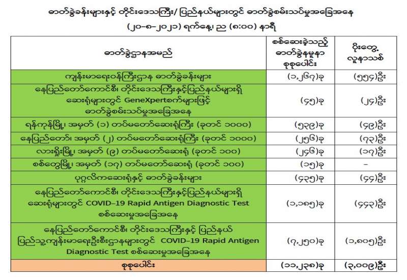 အကောက်ခွန်ဦးစီးဌာနအနေဖြင့် ကိုဗစ်-၁၉ ရောဂါ ကာကွယ်ထိန်းချုပ် ကုသရေးပစ္စည်းများကို လေကြောင်း၊ ဆိပ်ကမ်း၊ နယ်စပ်ဂိတ်အသီး သီးမှ ရုံးပိတ်ရက်ရှည်ကာလအတွင်း နေ့စဉ် ရုံးပိတ်ရက်မရှိလွယ်ကူချောမွေ့စွာ စစ်ဆေးထုတ်ပေးလျက်ရှိရာ ဩဂုတ် ၁၉ ရက်တွင် ရန်ကုန် အပြည်ပြည်ဆိုင်ရာလေဆိပ်၌ ကုမ္ပဏီ ၂၅ ခုမှ Favipiravir Tablets ၁၈၈၁ ခု၊ Test Kit ၆၇၆၀၊ LCD (Patient Monitor) ၃၀၊ Oximeter ၁၆၆၃ ခု၊ အိမ်သုံးအောက်ဆီဂျင်စက် ၇၃၉ ခု၊ Oxygen Mask ၅၀၀၀၊ Oxygen Sensor ၃၀၊ ရန်ကုန်ဆိပ်ကမ်းများမှ ကိုဗစ်-၁၉ ရောဂါကာကွယ် ကုသဆေးနှင့် အခြားဆေးမျိုးစုံ ၅၄၇၀၅ ဒသမ ၆၉ ကီလိုဂရမ်၊ နယ်စပ် | (မူဆယ်၊ ချင်းရွှေဟော်၊ မြဝတီ၊ တာချီလိတ်)တွင် ကုမ္ပဏီ ၂၃ ခုမှ | Oxygen Cylinder ၆၅၂၅ ခု၊ အိမ်သုံးအောက်ဆီဂျင်စက် ၅၉၆ ခု၊နှာခေါင်းစည်း ၆၅၅၃၈ ခု၊ Liquid Oxygen ၁၅၀၈၀ ဒသမ ၁ ကီလိုဂရမ်၊ Liquid Oxygen တန် ၂၀၊ Flow Meter ၆၃၀၀ ခု၊ တစ်ကိုယ်ရေသုံး ကာကွယ်ရေးဝတ်စုံ ၂၆၈၅၀၊ Oxygen Mask ၁၅၀၀၊ Trolley ၃၅၀၊ Disposable Syringe ၂၂၁၆၀၊ မျက်နှာအကာ ၁၀၂ ကီလိုဂရမ်၊ Goggle ၂၈၀ တို့ကို ထုတ်ပေးခဲ့ကြောင်း သိရသည်။