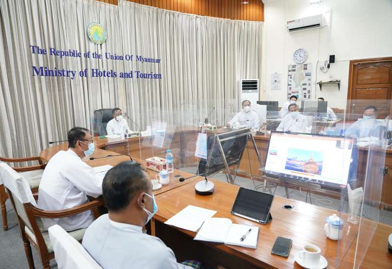 ဟိုတယ်နှင့်ခရီးသွားဆိုင်ရာ ဝန်ဆောင်မှုလုပ်ငန်းများကို ဘေးကင်းလုံခြုံသော ဝန်ဆောင်မှု လုပ်ငန်းများအဖြစ် အသိအမှတ်ပြုလက်မှတ်များ Online မှတစ်ဆင့် လျှောက်ထားအတည်ပြု ထုတ်ပေးနိုင်ရေးအတွက် “Enchanting Myanmar Health and Safety Protocol” Website မိတ်ဆက်ရှင်းလင်းခြင်း အခမ်းအနားကို ယနေ့ ညနေပိုင်းတွင် ဟိုတယ်နှင့် ခရီးသွားလာရေး ဝန်ကြီးဌာန၊ နီလာအစည်းအဝေးခန်းမ၌ Video Conferencing စနစ်ဖြင့် ကျင်းပပြုလုပ်သည်။