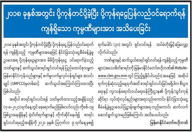 ကိုဗစ်-၁၉ ရောဂါ ကာကွယ်ကုသဆေးရရှိရေး၊ ရောဂါကူးစက် ပြန့်ပွားမှုကို ထိန်းချုပ်နိုင်ရေး၊ ကောင်းမွန်သော ကျန်းမာရေးစောင့်ရှောက်မှုများ နည်းလမ်းတကျရရှိရေးအတွက် ပြည်ထောင်စုသမ္မတ မြန်မာနိုင်ငံကုန်သည် များနှင့် စက်မှုလက်မှုလုပ်ငန်းရှင်များ အသင်းချုပ် (UMFCCI) သည် သက်ဆိုင်ရာကော်မတီများ၊ ဌာနများ၊ အဖွဲ့ အစည်းများနှင့် ချိတ်ဆက်၍ ပြည်တွင်းစီးပွားရေးလုပ်ငန်းရှင်များ၊ ကုန်သည်များ၊ အသင်းအဖွဲ့ ကိုယ်စားလှယ်များ နှင့် အရှိန်မြှင့်ပူးပေါင်းဆောင်ရွက်ပေးလျက်ရှိကြောင်း သိရသည်။