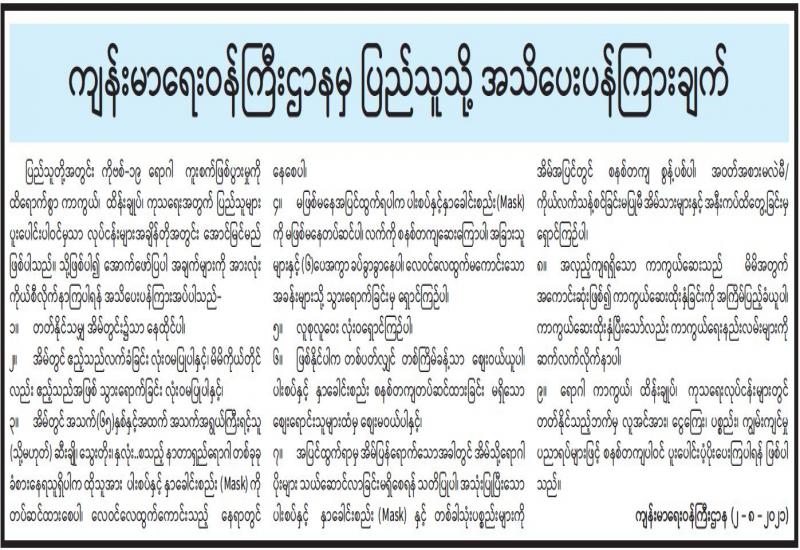 မြန်မာ့အသံနှင့် ရုပ်မြင်သံကြားမှ ဇူလိုင် ၃၁ ရက် ည ၈ နာရီသတင်းအပြီးတွင် ထုတ်လွှင့်ပြသခဲ့သည့် ကိုဗစ်- ၁၉ ရောဂါ ကာကွယ်ထိန်းချုပ်ရေးဆိုင်ရာ ဆောင်ရွက်ချက်များအကြောင်း သိကောင်းစရာ အစီအစဉ်ကို ပြည်သူများ သိရှိနိုင်ရန်အတွက် ပြန်လည်ဖော်ပြလိုက်ပါသည်။
