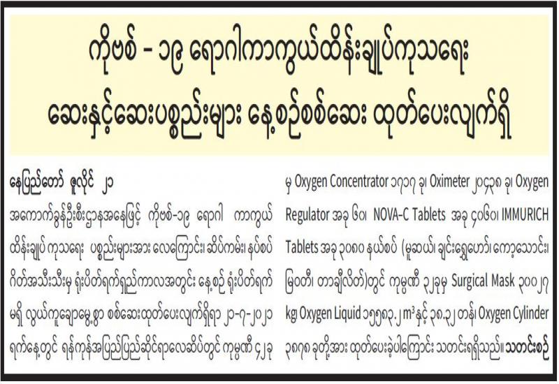 နိုင်ငံတော်အတွင်း၌ ကိုဗစ်-၁၉ ကာကွယ်၊ ထိန်းချုပ်၊ ကုသရေးလုပ်ငန်းများအတွက် အရေးတကြီး လိုအပ်လျက်ရှိသည့် အောက်ဆီဂျင်၊ ဆေးဝါးနှင့် ဆက်စပ်ပစ္စည်းများ ပြတ်လပ်မှုမရှိစေဘဲ အမြန်ဆုံးရောက်ရှိ နိုင်ရေးအတွက် အပြည်ပြည်ဆိုင်ရာ လေဆိပ်၊ ပင်လယ်ရေကြောင်းဆိပ်ကမ်းများနှင့် နယ်စပ်ကုန်သွယ်ရေးစခန်းများမှ အဆက်မပြတ် တင်သွင်း ခွင့်ပြုလျက်ရှိသည်။
