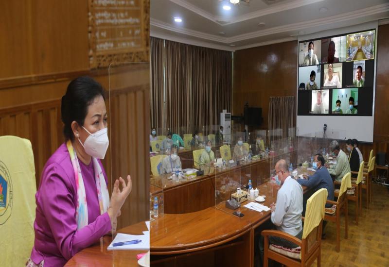 ကိုဗစ်-၁၉ ရောဂါ ကာကွယ်ကုသရေးလုပ်ငန်း ညှိနှိုင်းအစည်းအဝေးကို ယနေ့ နံနက် (၁၀) နာရီ တွင် ကျန်းမာရေးနှင့် အားကစားဝန်ကြီးဌာန COVID-19 Command Center ၌ ဗီဒီယို ကွန်ဖရင့်စနစ်ဖြင့် ကျင်းပရာ ကျန်းမာရေးနှင့် အားကစားဝန်ကြီးဌာန ပြည်ထောင်စုဝန်ကြီး ဒေါက်တာသက်ခိုင်ဝင်း တက်ရောက်ဆွေးနွေးသည်။