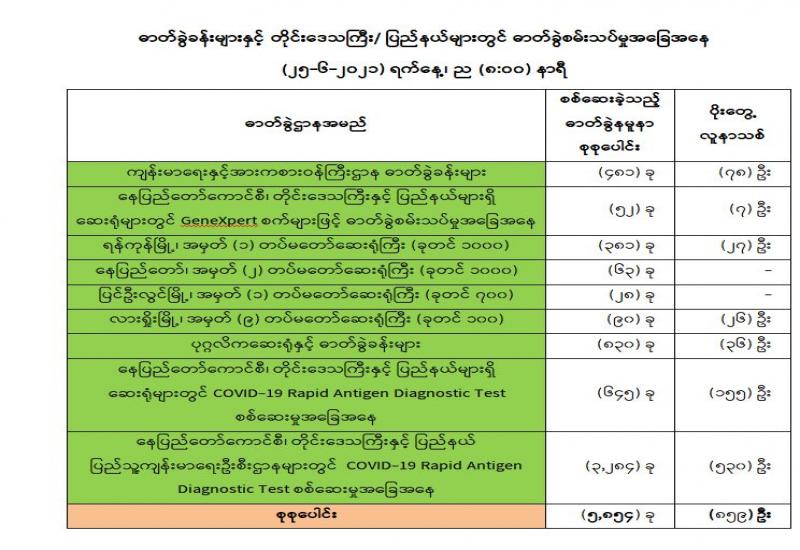 (၂၄-၆-၂၀၂၁) ရက်နေ့၊ ည (၈:၀၀) နာရီမှ (၂၅-၆-၂၀၂၁) ရက်နေ့၊ ည (၈:၀၀) နာရီအတွင်း ဓာတ်ခွဲနမူနာ စုစုပေါင်း (၅,၈၅၄)ခုအား စစ်ဆေးပြီးစီးခဲ့ရာ COVID-19 ရောဂါ ဓာတ်ခွဲအတည်ပြု လူနာသစ် (၈၅၉) ဦး တွေ့ရှိရပါသည်။ သို့ဖြစ်ပါ၍ ယနေ့အထိ ဓာတ်ခွဲနမူနာ စုစုပေါင်း (၂,၇၀၁,၄၀၀) ခု အား စစ်ဆေးခဲ့ပြီး COVID-19 ဓာတ်ခွဲအတည်ပြုလူနာ စုစုပေါင်း (၁၅၁,၅၇၃) ဦး ရှိပြီ ဖြစ်ပါသည်။