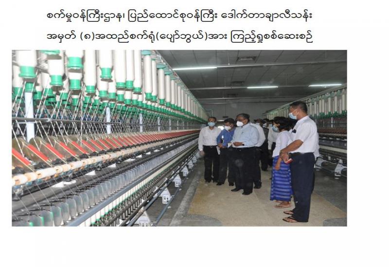 စက်မှုဝန်ကြီးဌာန ပြည်ထောင်စုဝန်ကြီး ဒေါက်တာချာလီသန်းသည် ယနေ့နံနက်ပိုင်းတွင် မန္တလေးတိုင်းဒေသကြီး၊ မလှိုင်မြို့ရှိ ဝါကြိတ်စက်ရုံသို့ ရောက်ရှိပြီး စက်ရုံတာဝန်ခံက စက်ရုံဆိုင်ရာ အချက်အလက်များကို ရှင်းလင်းတင်ပြရာ ပြည်ထောင်စုဝန်ကြီးက ဝါကြိတ် စက်ရုံများ လည်ပတ်ရန်အတွက် ဝါကြိတ်စက်များကိုလည်း ပြန်လည်စစ်ဆေးပြုပြင်ထားရမည် ဖြစ်ကြောင်း၊ စက်ရုံများ၏ လုံခြုံရေးနှင့် မီးဘေးအန္တရာယ် မဖြစ်ပွားစေရေး အထူးအလေး ထားဆောင်ရွက်ရန် မှာကြားပြီး ဝါကြိတ်စက်များ ပြုပြင်နေမှုများကို လှည့်လည်စစ်ဆေးသည်။