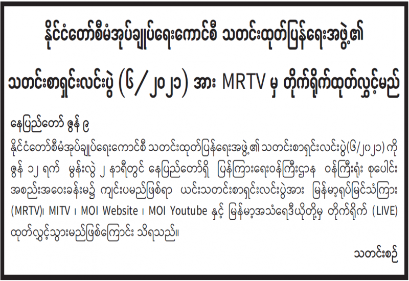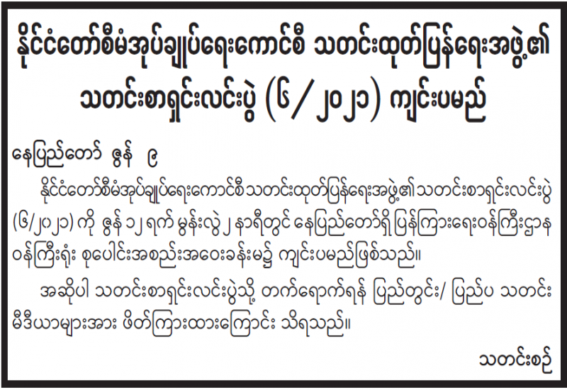 ပြည်တွင်းနေရပ်စွန့်ခွာသူများ ပြန်လည်နေရာချထားရေးနှင့် ယာယီခိုလှုံရာစခန်းများ ပိတ်သိမ်း ရေးဆိုင်ရာ အမျိုးသားအဆင့်ကော်မတီ အစည်းအဝေး ၂/၂၀၂၁ ကို ယနေ့ မွန်းလွဲ ၁ နာရီတွင် နယ်စပ်ရေးရာဝန်ကြီးဌာန စုပေါင်းအစည်းအဝေးခန်းမ၌ ကျင်းပသည်။