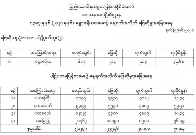သာသနာရေးနှင့် ယဉ်ကျေးမှုဝန်ကြီးဌာန သာသနာရေးဦးစီး ဌာနကကြီးမှူး၍ နှစ်စဉ်ကျင်းပသော ဓမ္မာစရိယစာမေးပွဲကို ယနေ့ မွန်းတည့်၁၂ နာရီမှ ညနေ ၄ နာရီအထိ နိုင်ငံတစ်ဝန်းလုံးရှိ စာဖြေဌာန ၅၉ ဌာနတို့၌ (နဝမနေ့)အဖြစ်လည်းကောင်း၊ ပါဠိပထမပြန်စာမေးပွဲကို ယနေ့မွန်းတည့် ၁၂ နာရီမှ မွန်းလွဲ ၃ နာရီအထိ နိုင်ငံတစ်ဝန်းလုံးရှိ စာဖြေဌာန ၂၄၁ ဌာနတို့၌ (တတိယနေ့)အဖြစ်လည်းကောင်း ဖြေဆိုကြသည်။