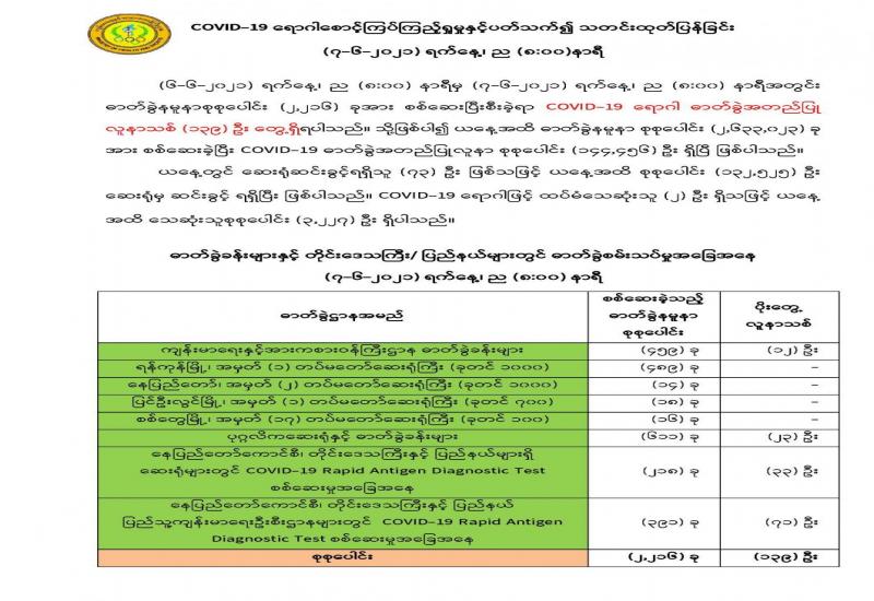 ကိုဗစ်-၁၉ ကပ်ရောဂါပိုးတွေ့ လူနာများ တွေ့ရှိမှုရာခိုင်နှုန်းများ ရုတ်တရက်မြင့်တက်လာမှုကို အမှတ်တမဲ့မနေကြဘဲ ပြည်သူ အချင်းချင်း အပြန်အလှန်အသိပေး၊ သတိပေးကြရန် လိုအပ်နေပြီ ဖြစ်သည်။ စစ်ကိုင်းတိုင်းဒေသကြီးနှင့် ချင်းပြည်နယ်တို့တွင်ရှိသည့် မြို့နယ်အချို့တို့တွင် ရောဂါဖြစ်ပွားမှုများ အစုလိုက် အပြုံလိုက်တွေ့ရှိခြင်း၊ ပိုးတွေ့လူနာအရေအတွက် ရုတ်တရက် မြင့်တက်လာခြင်း တို့ ကြောင့် နေအိမ်တွင် နေထိုင်ရေးအစီအစဉ် Stay at Home သတ်မှတ်ခဲ့သလို ပြည်တွင်းလေကြောင်း ခရီးစဉ်အချို့ကိုလည်း ယာယီရပ်နားထားခဲ့ရသည်။