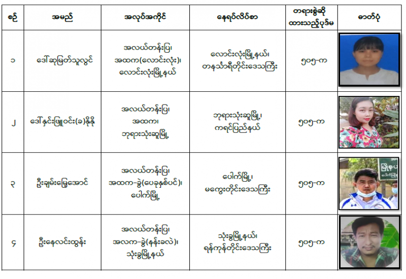 နိုင်ငံတော်၏အုပ်ချုပ်မှုယန္တရားပျက်ပြားစေရန် ရည်ရွယ်ချက်ဖြင့် နိုင်ငံ့ဝန်ထမ်းများနှင့် ကျန်းမာရေးဝန်ထမ်းများအား CDM လှုပ်ရှားမှုများတွင် ပါဝင်လာစေရန် လှုံ့ဆော်ခြင်း၊ ၎င်းတို့ကိုယ်တိုင် CDM လှုပ်ရှားမှုများတွင် ပါဝင်လုပ်ဆောင်ခြင်း၊ CDM လှုပ်ရှားမှု အပေါ် ထောက်ခံအားပေးခြင်း၊ အကြမ်းဖက်အုပ်စုများအဖြစ် သတ်မှတ်ကြေညာထားသည့် CRPH နှင့် NUG တို့အား ထောက်ခံအားပေးခြင်းတို့ကို ဆောင်ရွက်လျက်ရှိသည့် အောက်ဖော် ပြပါ သူနာပြုများအား ရာဇသတ်ကြီးပုဒ်မ ၅၀၅-က ဖြင့် အမှုဖွင့်အရေးယူဆောင်ရွက် ထားပြီးဖြစ်ပါသည်-